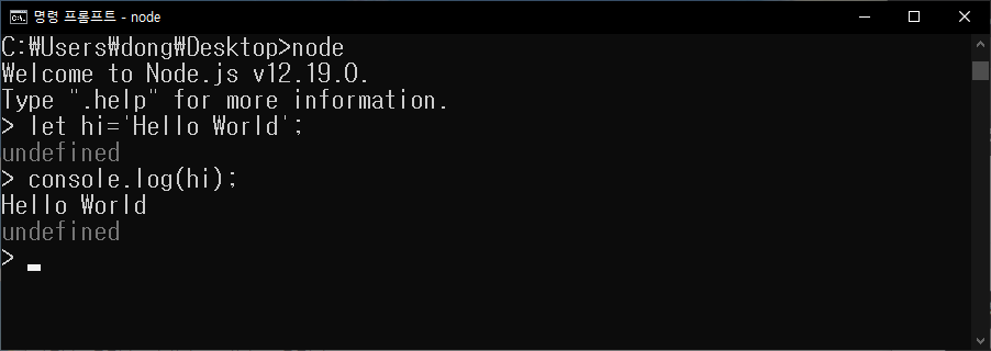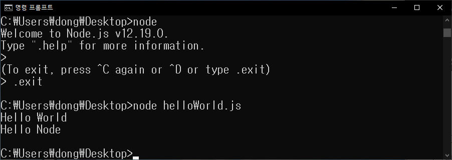 명령 프롬프트 창에서 node를 이용하여 Hello World 출력