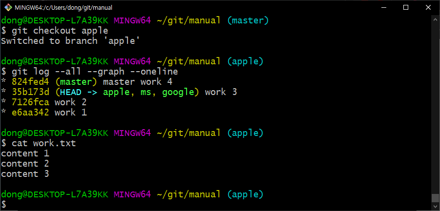 apple 브랜치가 있는 work 3 버전의 내용으로 work.txt파일이 돌아갔습니다